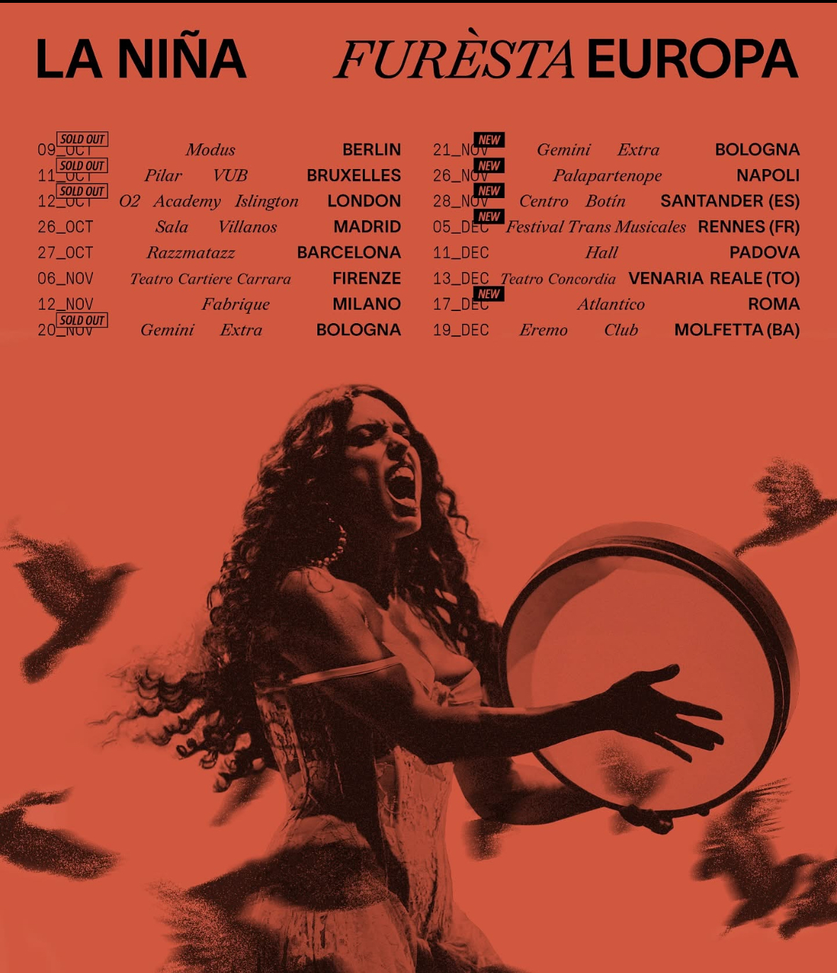 Qui La Niña si esibirà in città simbolo come Firenze, Milano, Bologna, Padova, Torino, Roma, Napoli e Molfetta, dove il viaggio si concluderà il 19 dicembre all’Eremo Club.
