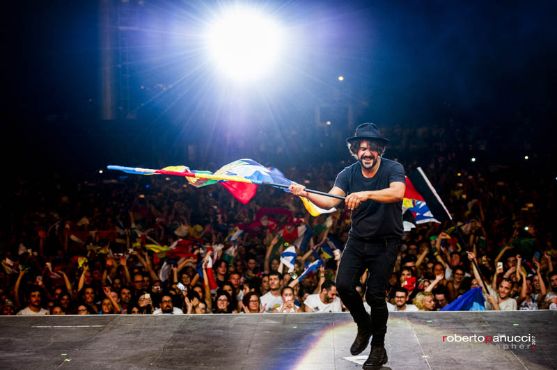 La set list è stata un susseguirsi dei suoi principali successi intervallati da brani come Apriti Cielo, Babalù, hit del nuovo progetto discografico, e Arca di Noè dove tutto il pubblico è stato coinvolto a partecipare ad una coreografia emozionante. Ognuno dei presenti ha sventolato frammenti di bandiera che hanno creato un tappeto di colori a perdita d’occhio come a voler dire che “senza confini le bandiere sono solo colori”.